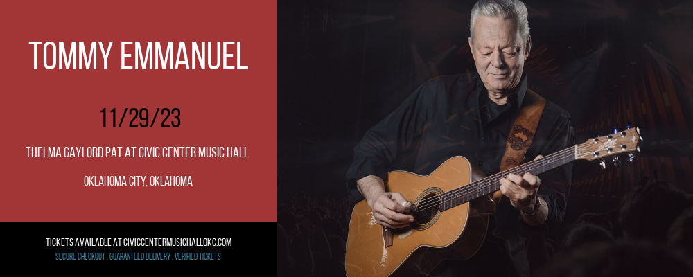 The epic Tommy Emmanuel are going to be peforming live at Thelma Gaylord PAT At Civic Center Music Hall in Oklahoma City, Oklahoma this November. On Wednesday 29th November 2023 the one and only Tommy Emmanuel will be on stage at Thelma Gaylord PAT At Civic Center Music Hall . If you love Jazz or Blues you won't want to miss this show!