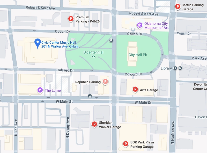 There are two main options available for parking at the City Civic Center music hall. The private lot is available at at 610 Colcord Drive, located just across the street from the south access ramp. The theatre is also in partnership with the Central Oklahoma Parking Authority, offering an extra 830 parking spaces at the Arts District Parking Garage, 431 W Main Street.