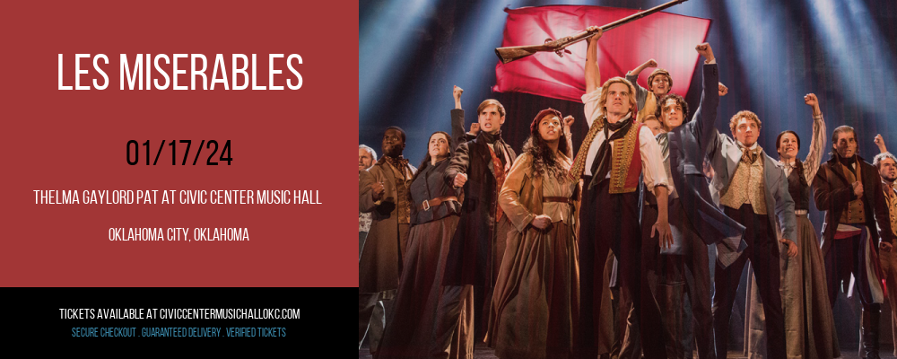 Are you ready for an emotion that you won’t forget any time soon? Are you excited to watch one of the best Broadway Musical productions at the greatest venue in Oklahoma City, Oklahoma? Then now’s the time to purchase your ticket to see Les Miserables on Wednesday 17th January 2024 only at the Thelma Gaylord PAT At Civic Center Music Hall . Not only will this be your unique opportunity this renowned theater company perform, but it will also be your chance to experience the many perks and benefits that are free only to ticket holders. Just imagine, you could be experiencing this world famous show now. You will be kept taken care of with your selection of refreshments from the bar and can chill and enjoy the show from your comfortable seat. To make sure you can experience this venue for yourself, click the Buy Tickets button below and order your tickets before they sell out!