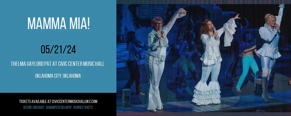 You can buy Thelma Gaylord PAT At Civic Center Music Hall Mamma Mia! tickets easily by going to TicketSqueeze.com or by clicking the "Buy Tickets" button on this page. Alternatively you can visit the Thelma Gaylord PAT At Civic Center Music Hall Box Office directly, or call them on (405) 297-2584.