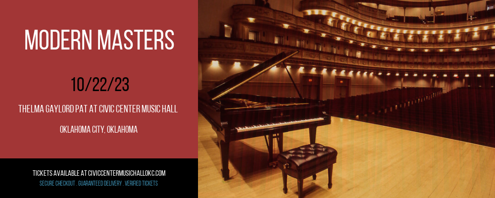 You can buy Thelma Gaylord PAT At Civic Center Music Hall Modern Masters tickets easily by going to TicketSqueeze.com or by clicking the "Buy Tickets" button on this page. Alternatively you can visit the Thelma Gaylord PAT At Civic Center Music Hall Box Office directly, or call them on (405) 297-2584.
